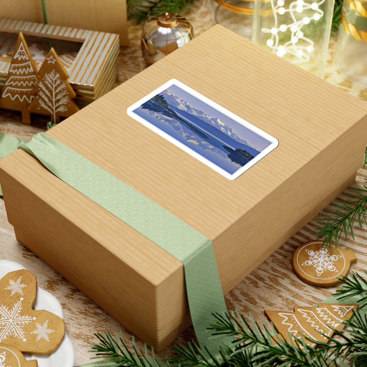 A slim glossy sticker that captures a tranquil mountain lagoon at dawn. Cool blues and soft lilacs blend across a wide panoramic scene, reflecting rugged peaks and still water with painterly clarity. The kiss-cut format peels neatly from its backing so you can place it on laptops, journals, water-resistant cases, or bedroom windows to add a calm, scenic accent. It feels like a quiet morning by the shore—subtle, reflective, and made to linger in small places where you notice it every day.