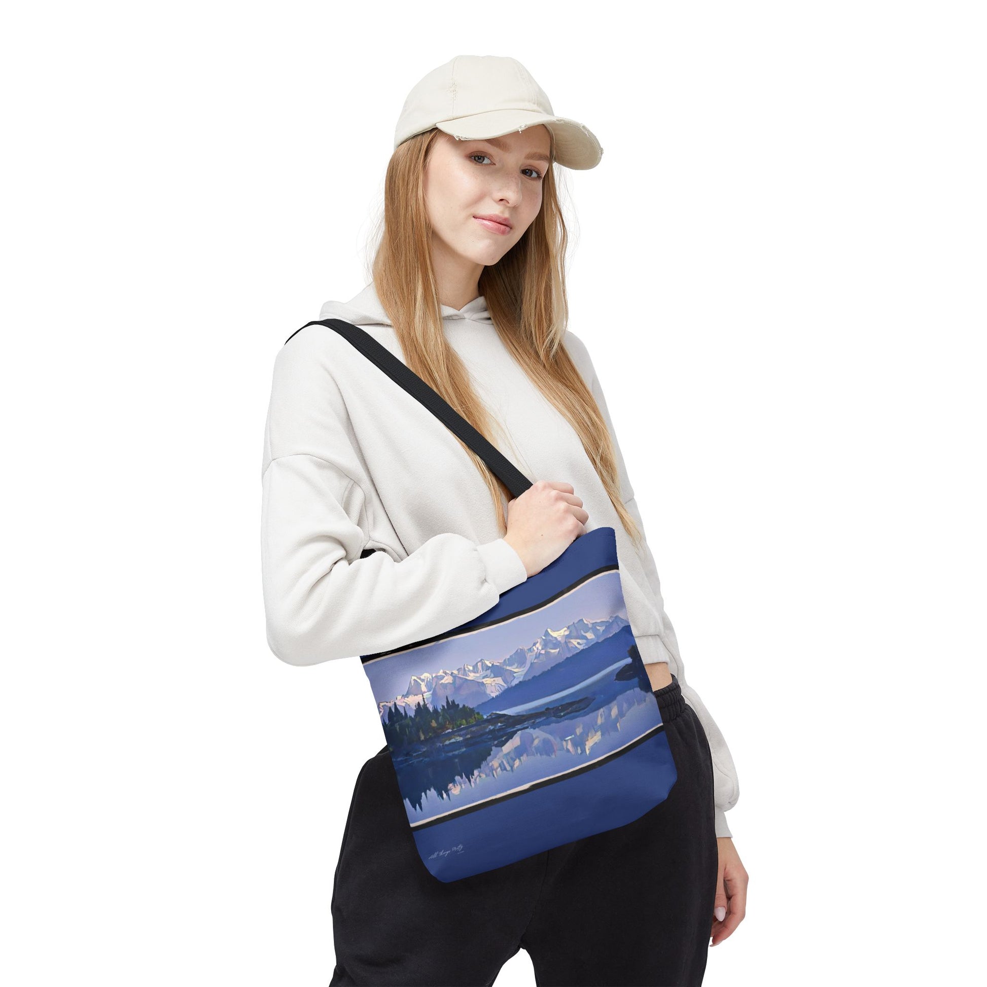 Carry a quiet morning in your hands. This sturdy polyester tote is printed edge-to-edge with a soft, painterly landscape—snow-capped peaks, a still lake, and a tiny evergreen silhouette tucked against the shore. Colors blend in cool lavenders and blues that feel like dawn light. It’s roomy enough for a sketchbook, market finds, or a camera, and the reinforced handles and boxed corners mean it travels with you without sagging. Each outing becomes a small escape to that calm shoreline.