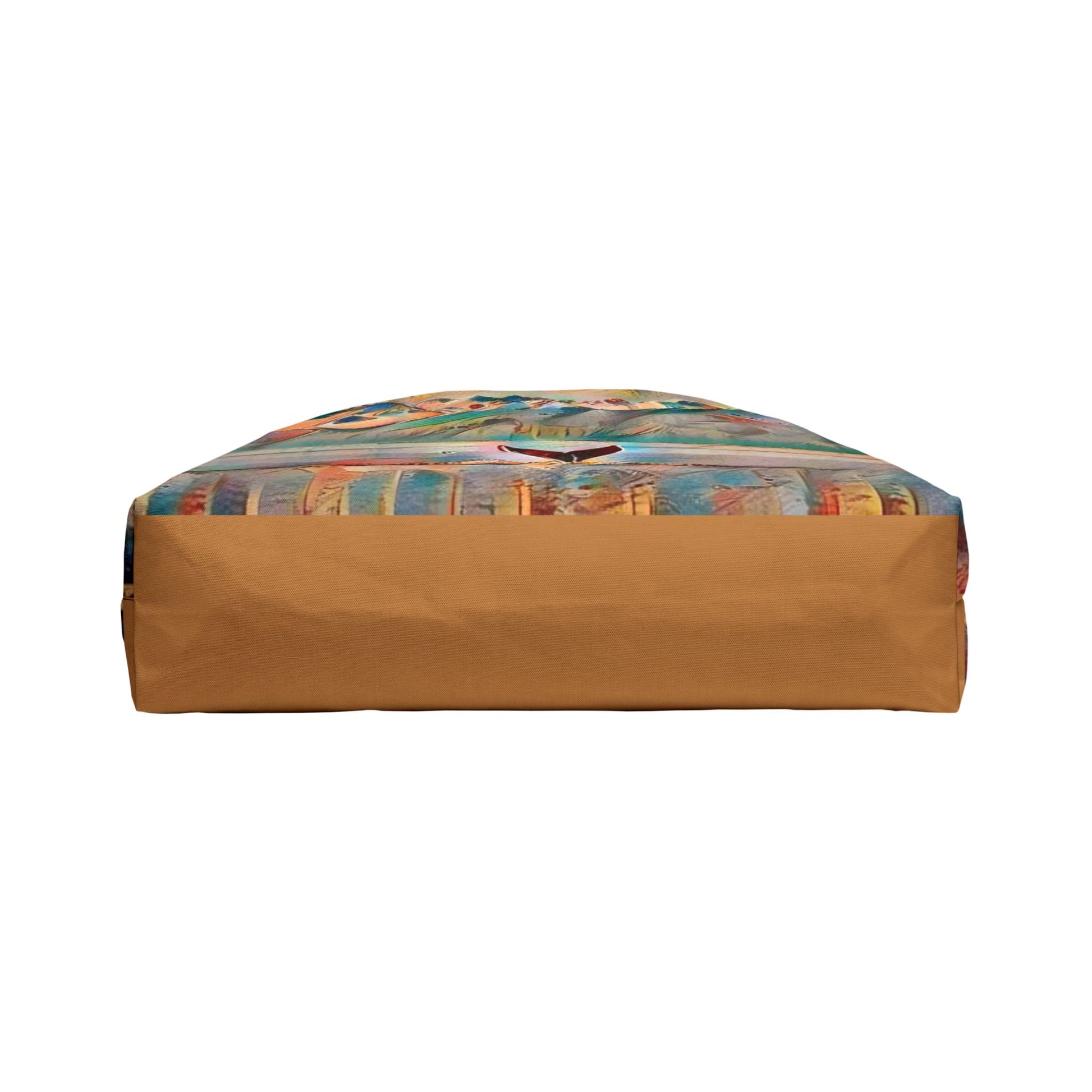 This spacious weekender tote carries a soft, painterly landscape across its full surface — a sunrise of warm golds, teal mountains, and a lone whale tail breaking a mirrored shore. Thick black woven handles and a structured T-bottom make it feel steady in hand. Lightweight spun polyester holds the art’s vibrant colors and resists wrinkling, while the dark cotton-poly lining keeps contents discreet. Bring it on short trips, market mornings, or days when you want your carryall to look like a small, moving artwork.