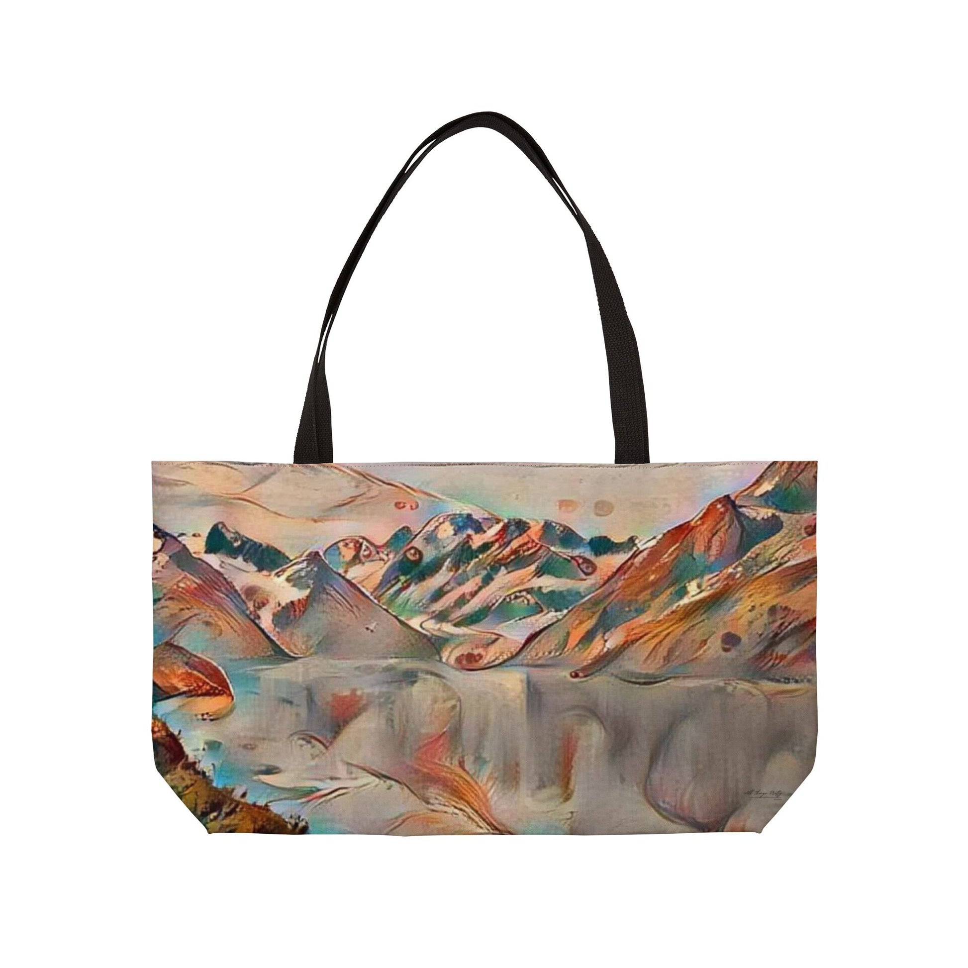 This roomy weekender tote carries the warm hush of dawn at a mountain lake. Soft painterly strokes of rust, teal, and slate sweep across the bag like reflected light on water. It opens wide for sweaters, a thermos, sketchbook, or groceries, and the structured T-bottom keeps everything upright while you move. The black woven handles sit comfortably on the shoulder and the dark-lined interior keeps contents discreet. Bring it on weekend escapes, art-show strolls, or slow mornings at the farmers’ market — it feels like carrying a little landscape with you.